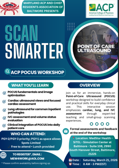 We hope you'll join us for an upcoming POCUS event planned just for our Resident members on Saturday, March 21, 8am-3pm This event is free with lunch will be provided!